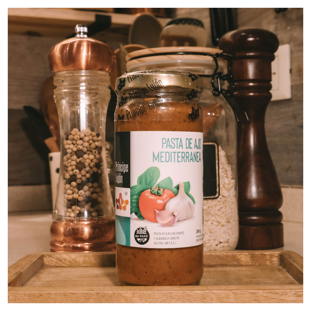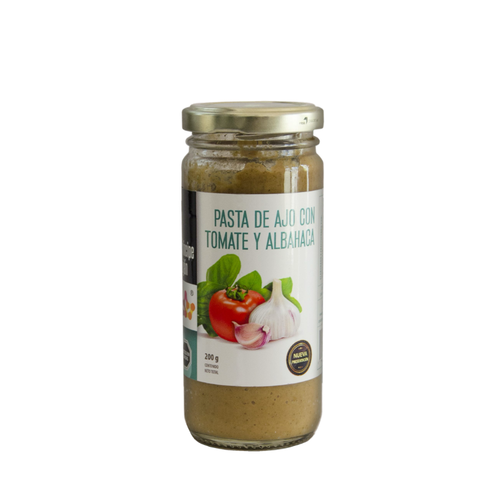 Ajo, Tomate en Polvo, Albahaca, Aceite de Girasol, Agua, Ácido Cítrico y Benzoato de Sodio.