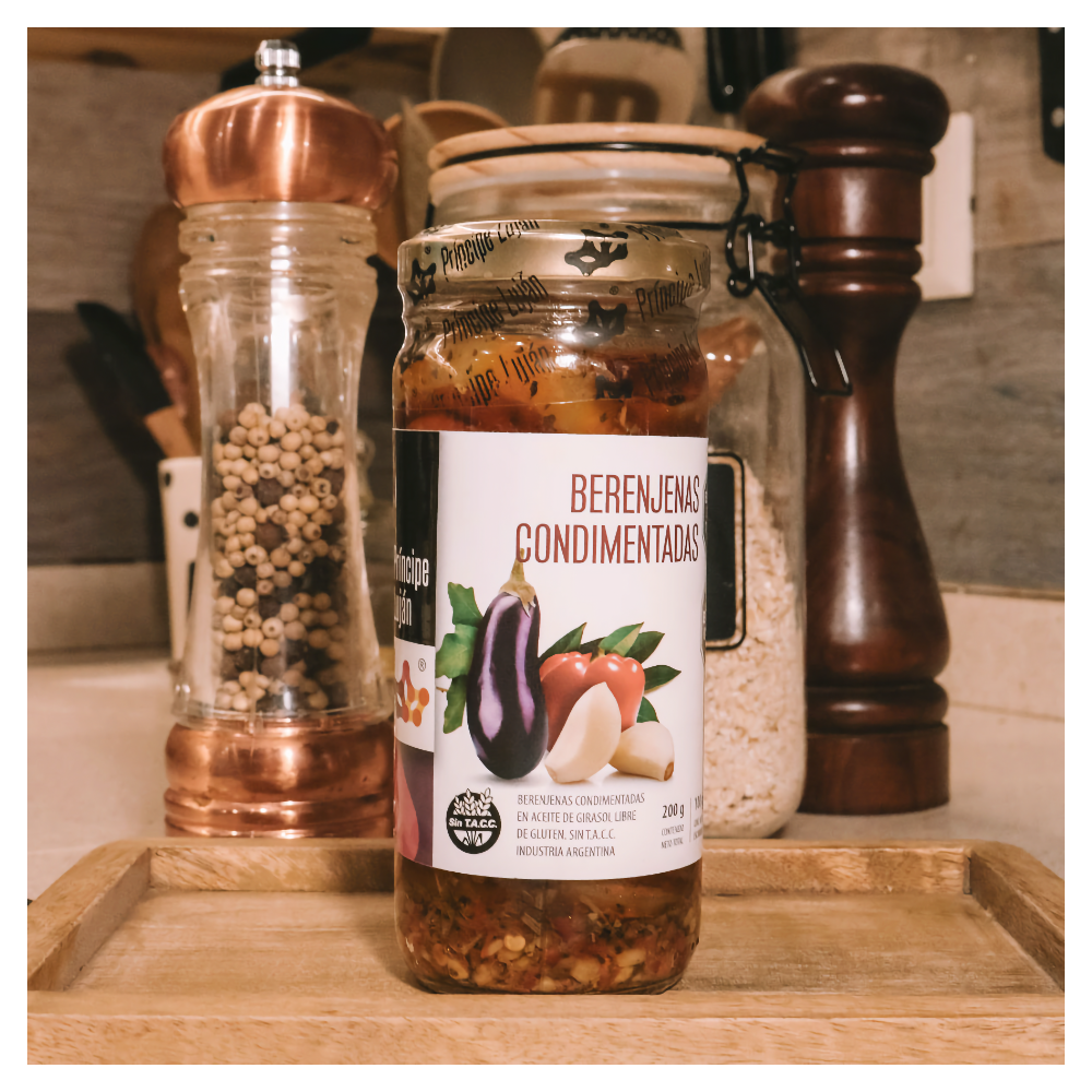 Berenjenas, Aceite de girasol, Oregano, Ajo, Aji molido, Laurel – Pimienta, Agua, Vinagre de alcohol.